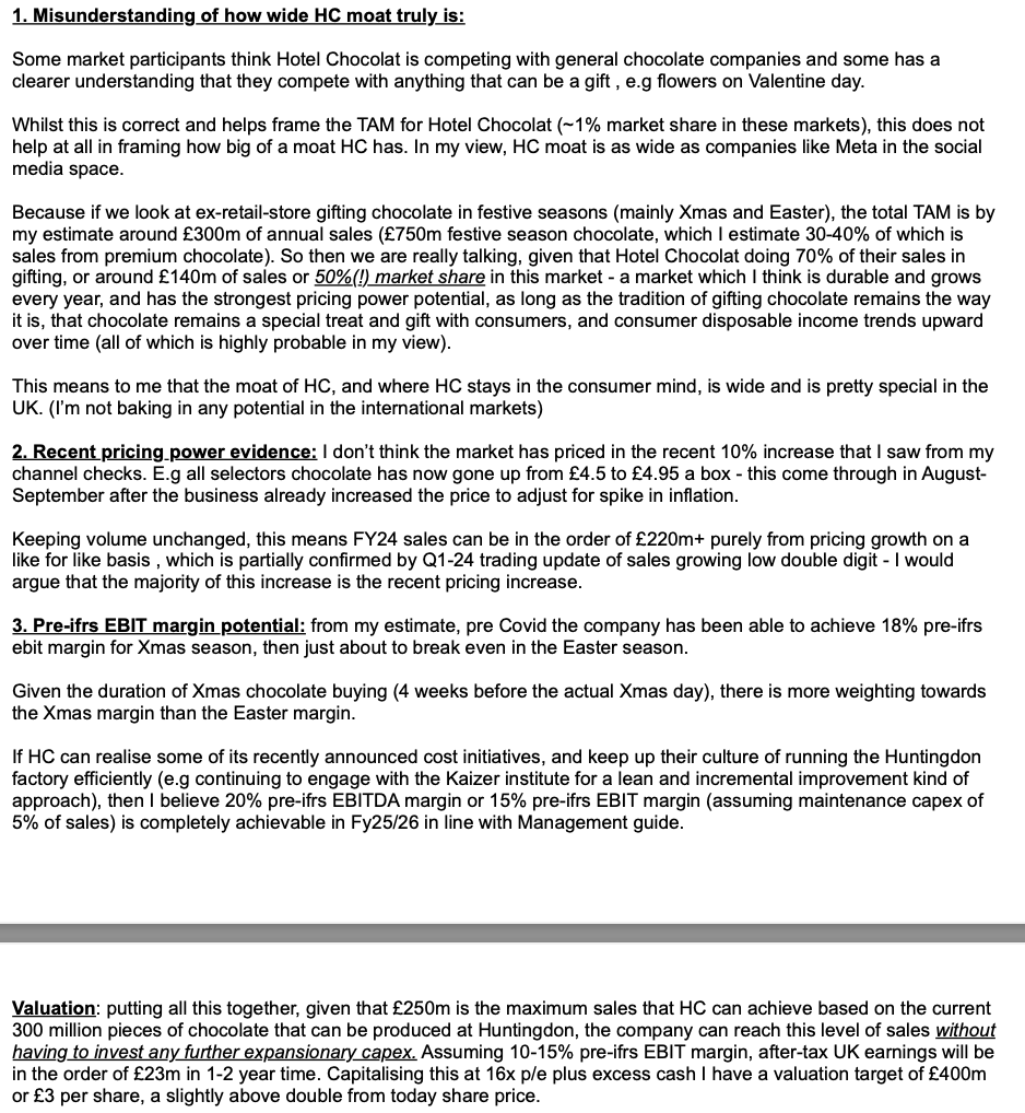 For reference I have posted below a write up on Hotel Chocolat I wrote in a stock-pitch email, dated 31 October 2023, just couple weeks before the announced takeover: